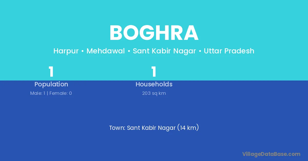 Sant Kabir Nagar (14 km) is the nearest town to Boghra village for major economic activities and is located approximately 14 km away.