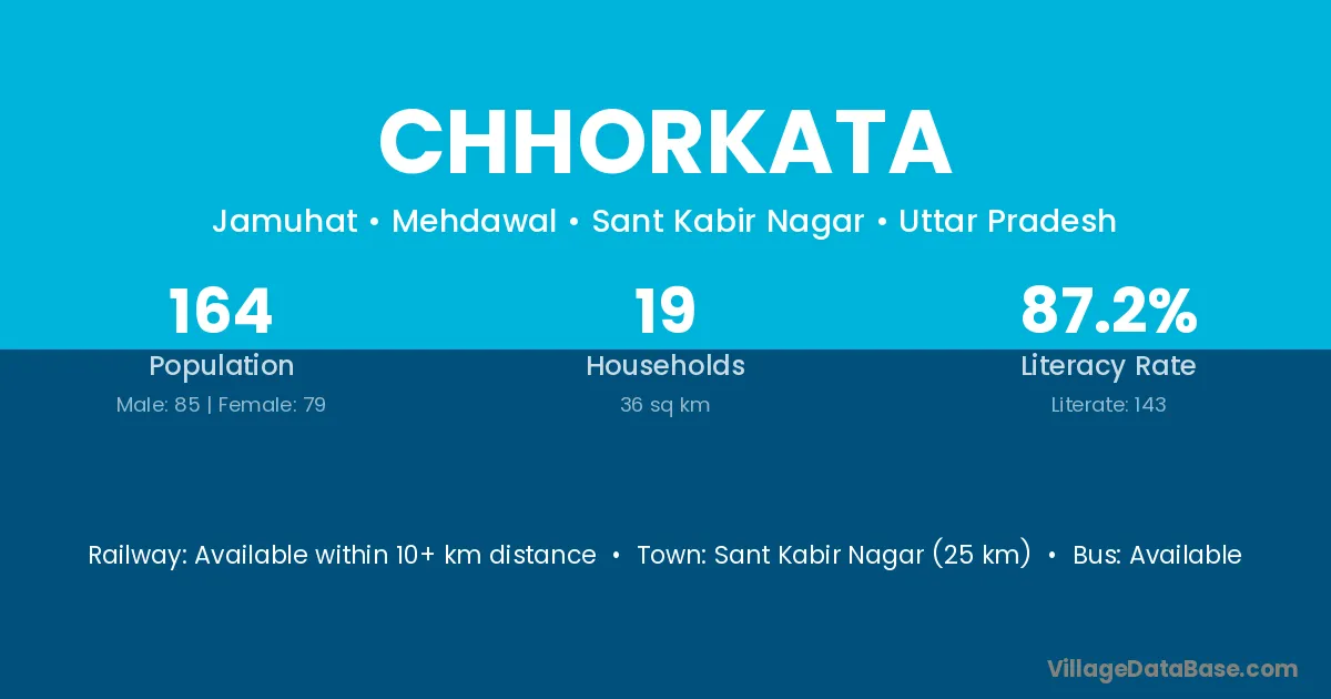 Sant Kabir Nagar (25 km) is the nearest town to Chhorkata village for major economic activities and is located approximately 25 km away.