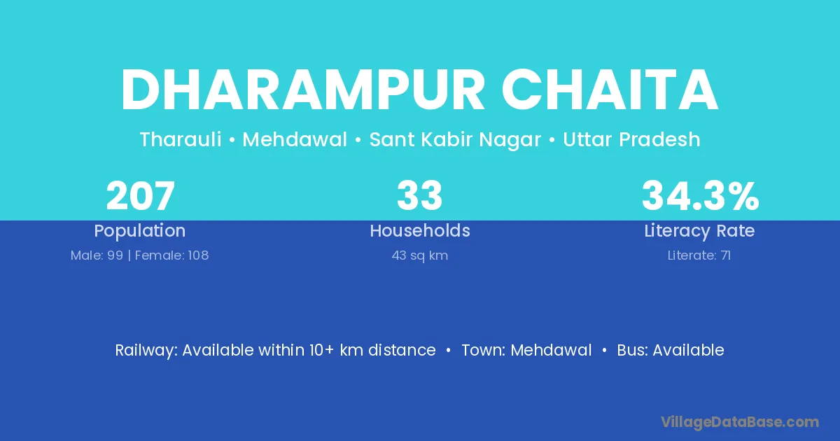 Dharampur Chaita village has a total population of 207 people, of which 99 are males and 108 are females.