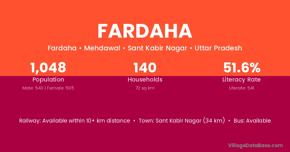 Sant Kabir Nagar (34 km) is the nearest town to Fardaha village for major economic activities and is located approximately 34 km away.