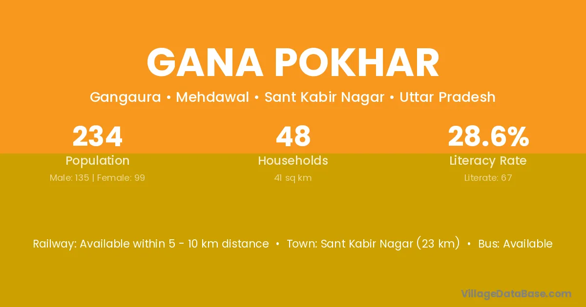 Sant Kabir Nagar (23 km) is the nearest town to Gana Pokhar village for major economic activities and is located approximately 23 km away.