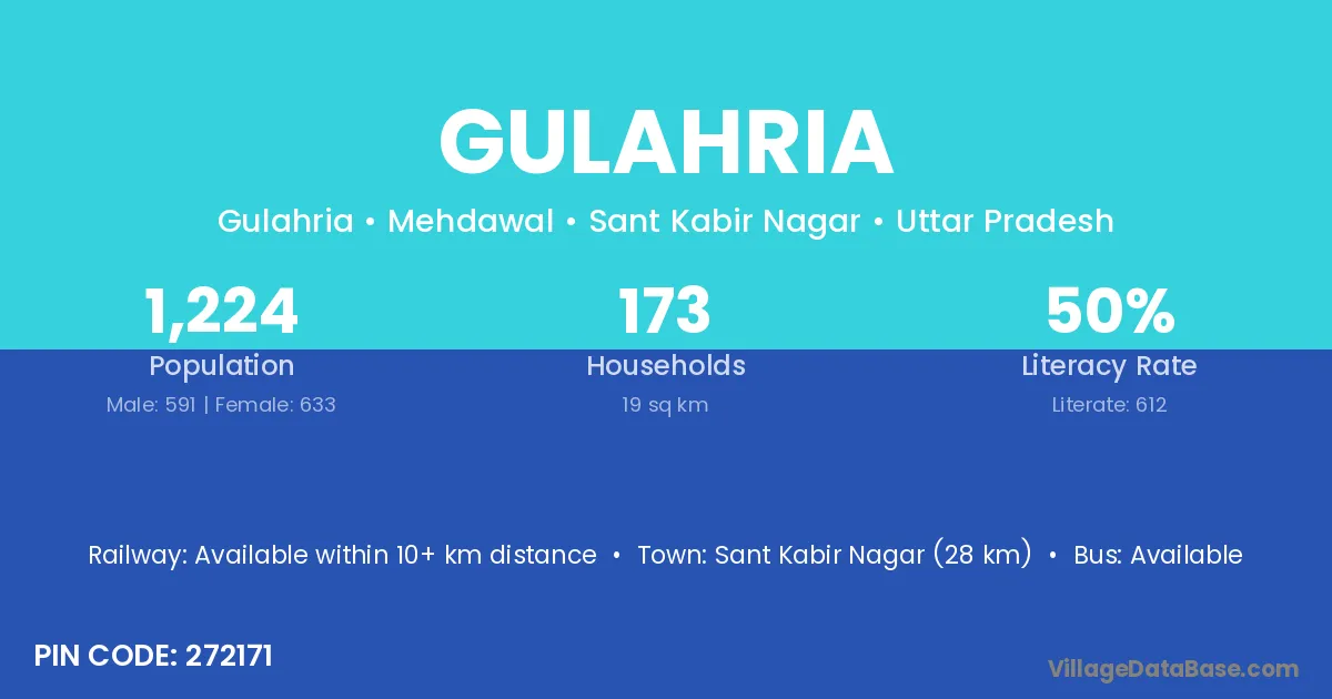 Sant Kabir Nagar (28 km) is the nearest town to Gulahria village for major economic activities and is located approximately 28 km away.