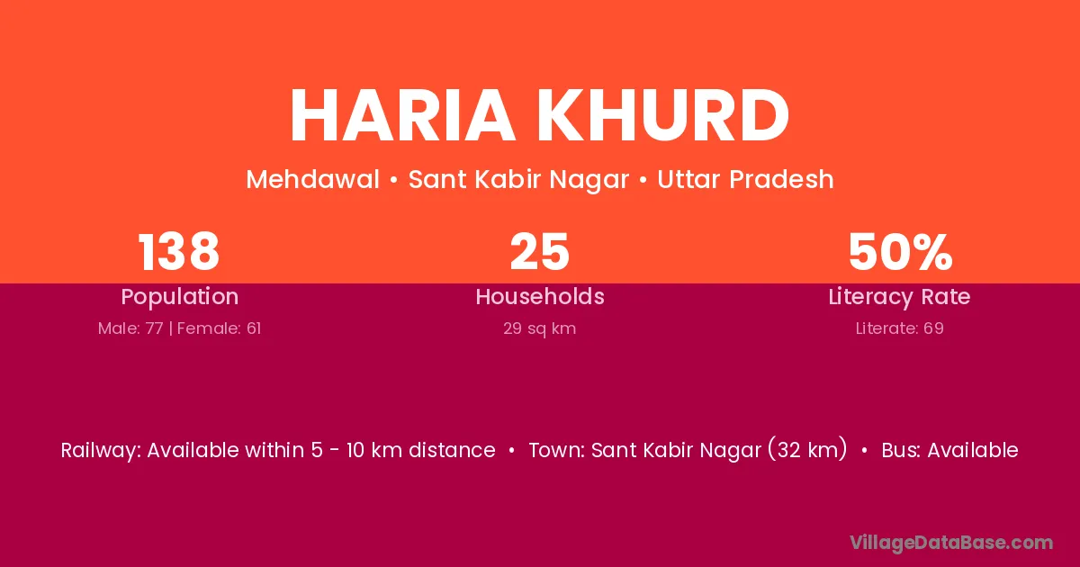 Sant Kabir Nagar (32 km) is the nearest town to Haria Khurd village for major economic activities and is located approximately 32 km away.