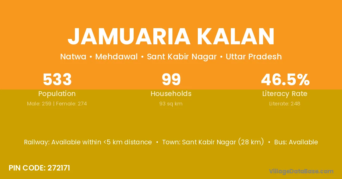 Sant Kabir Nagar (28 km) is the nearest town to Jamuaria Kalan village for major economic activities and is located approximately 28 km away.