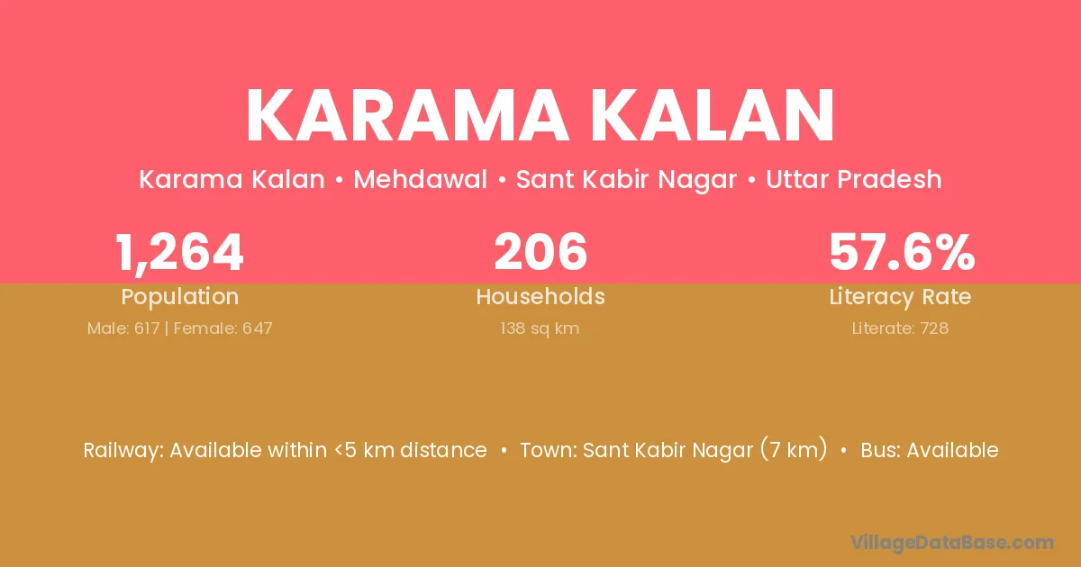 Sant Kabir Nagar (7 km) is the nearest town to Karama Kalan village for major economic activities and is located approximately 7 km away.