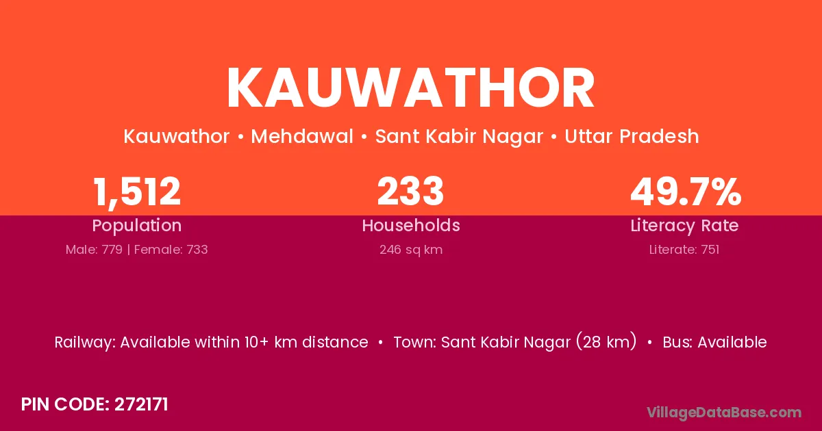 Sant Kabir Nagar (28 km) is the nearest town to Kauwathor village for major economic activities and is located approximately 28 km away.