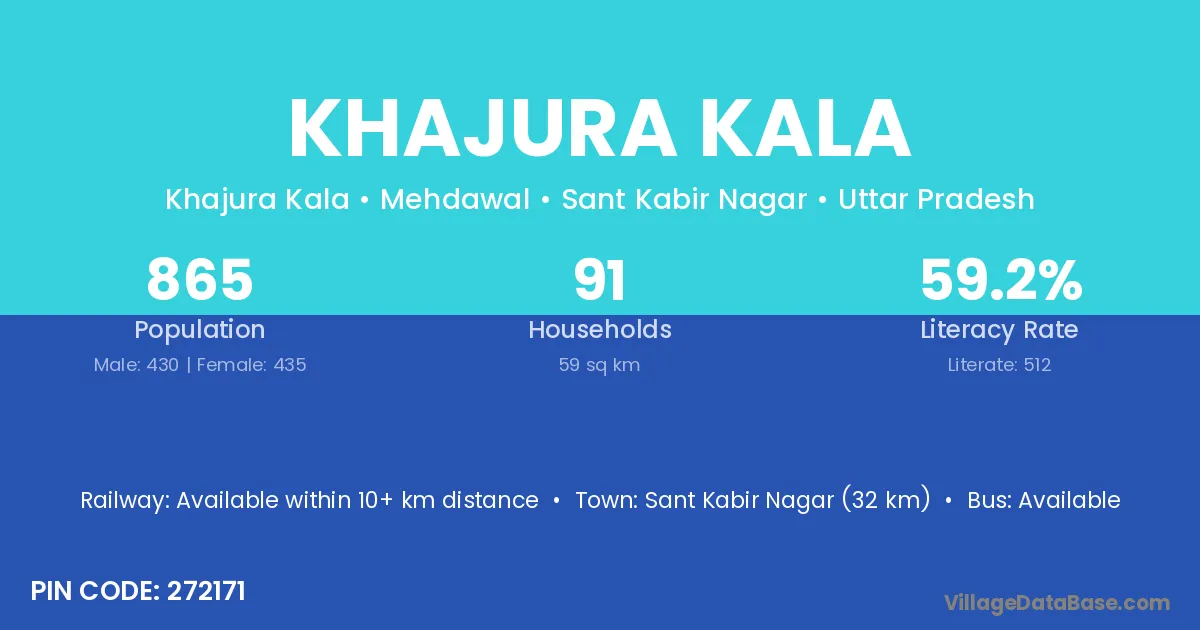 Sant Kabir Nagar (32 km) is the nearest town to Khajura Kala village for major economic activities and is located approximately 32 km away.
