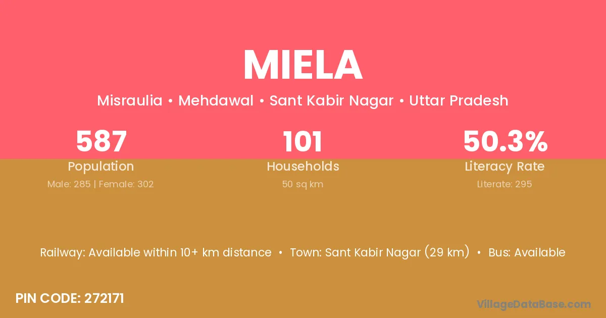 Sant Kabir Nagar (29 km) is the nearest town to Miela village for major economic activities and is located approximately 29 km away.