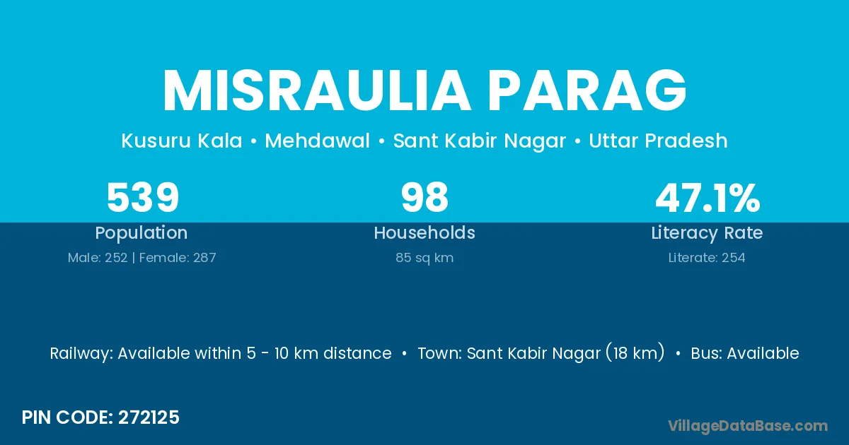 Sant Kabir Nagar (18 km) is the nearest town to Misraulia Parag village for major economic activities and is located approximately 18 km away.