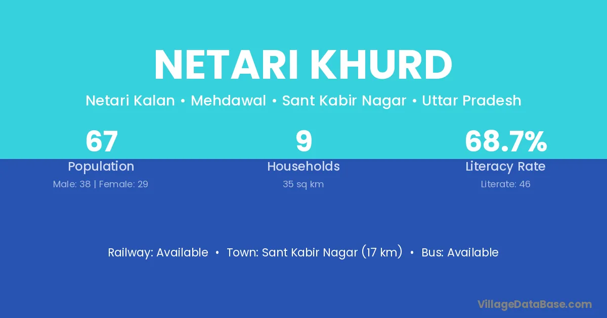 Sant Kabir Nagar (17 km) is the nearest town to Netari Khurd village for major economic activities and is located approximately 17 km away.