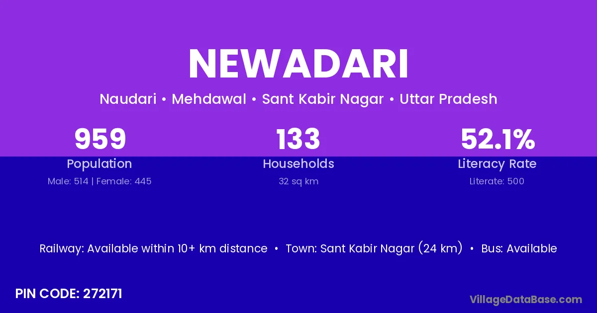 Sant Kabir Nagar (24 km) is the nearest town to Newadari village for major economic activities and is located approximately 24 km away.