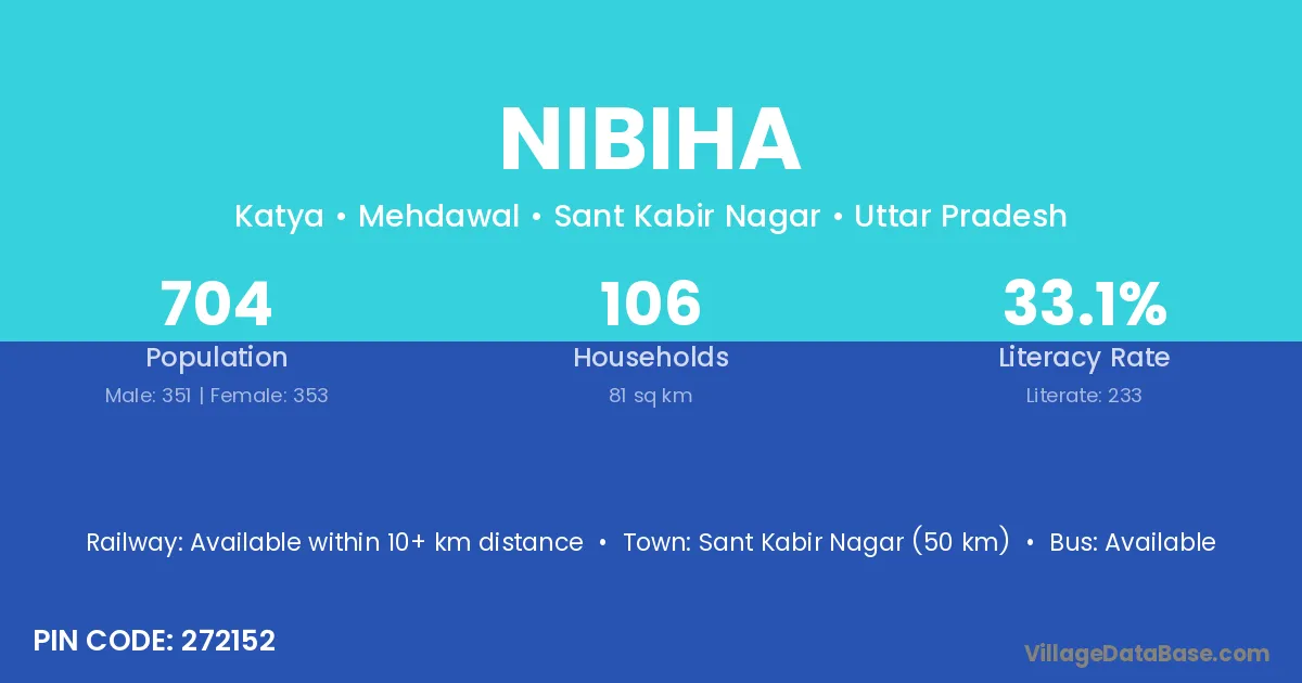 Sant Kabir Nagar (50 km) is the nearest town to Nibiha village for major economic activities and is located approximately 50 km away.