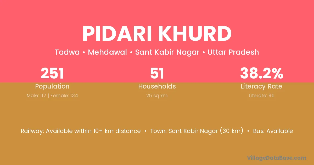 Sant Kabir Nagar (30 km) is the nearest town to Pidari Khurd village for major economic activities and is located approximately 30 km away.