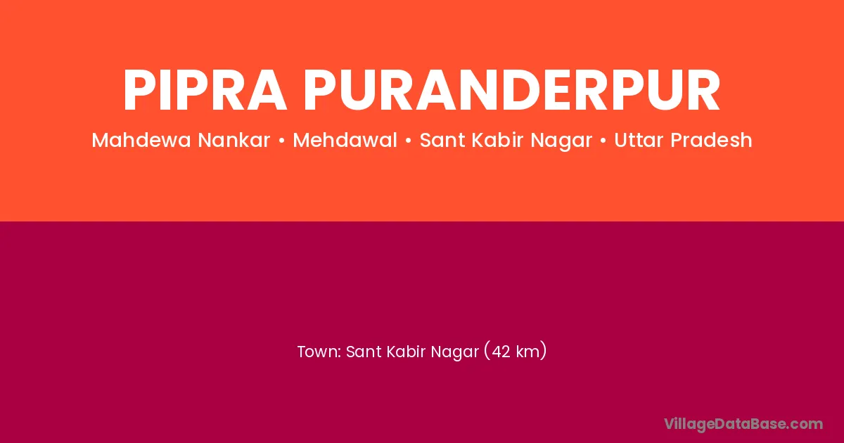 Sant Kabir Nagar (42 km) is the nearest town to Pipra Puranderpur village for major economic activities and is located approximately 42 km away.