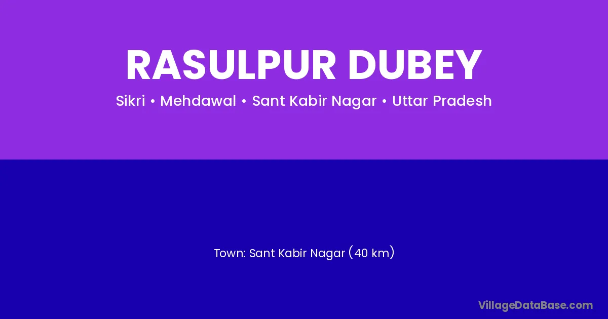 Sant Kabir Nagar (40 km) is the nearest town to Rasulpur Dubey village for major economic activities and is located approximately 40 km away.