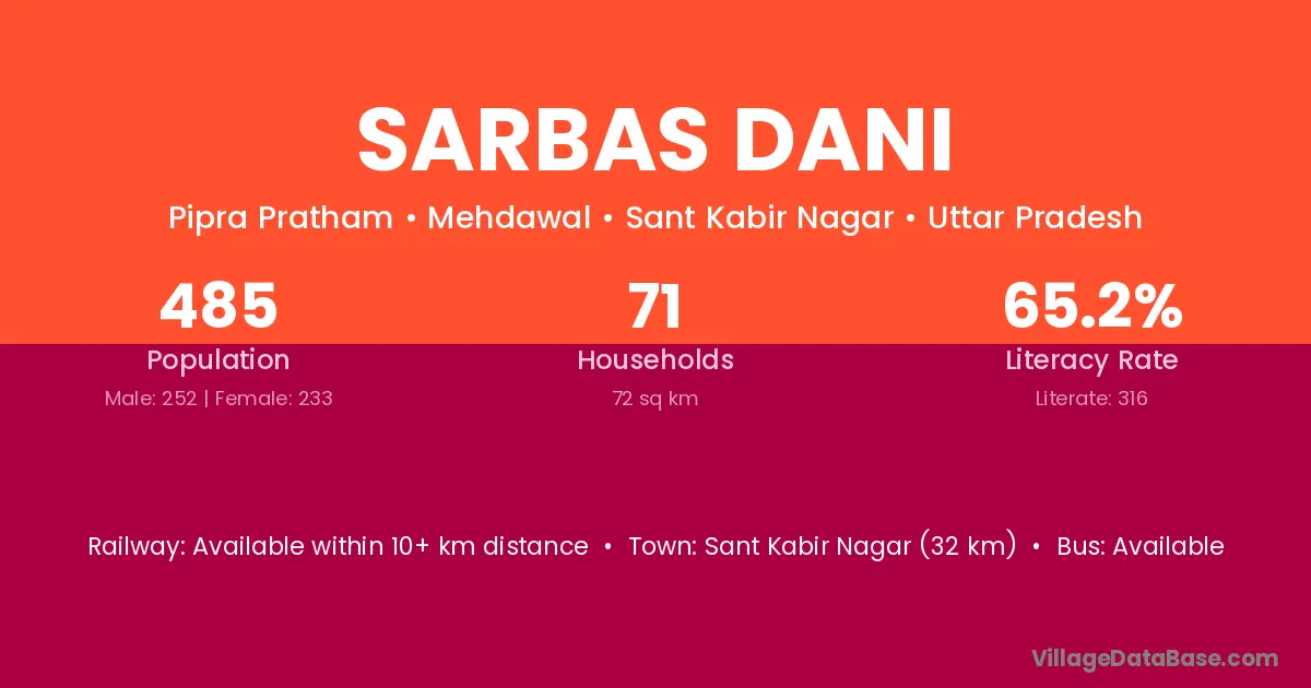 Sant Kabir Nagar (32 km) is the nearest town to Sarbas Dani village for major economic activities and is located approximately 32 km away.
