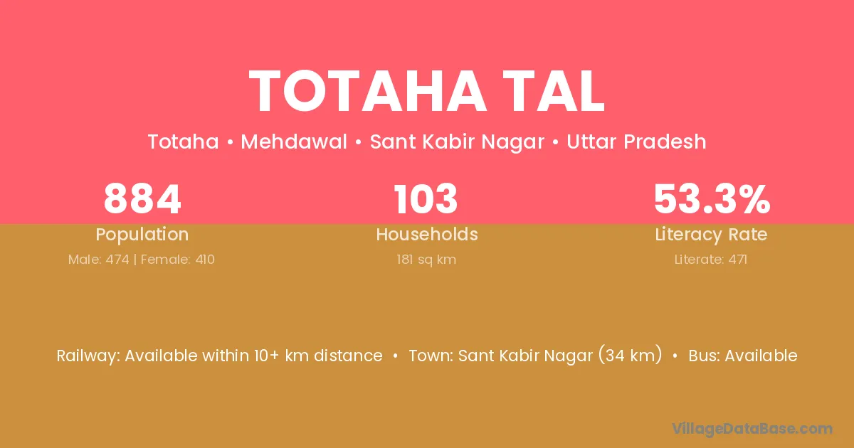 Sant Kabir Nagar (34 km) is the nearest town to Totaha Tal village for major economic activities and is located approximately 34 km away.