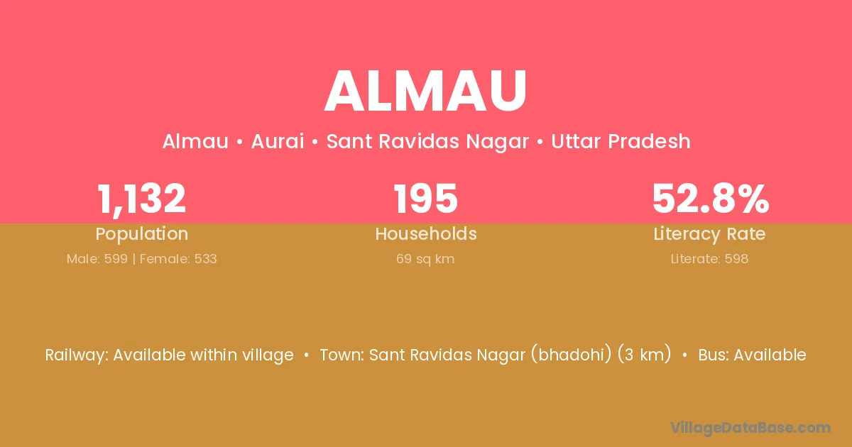 Sant Ravidas Nagar (bhadohi) (3 km) is the nearest town to Almau village for major economic activities and is located approximately 3 km away.