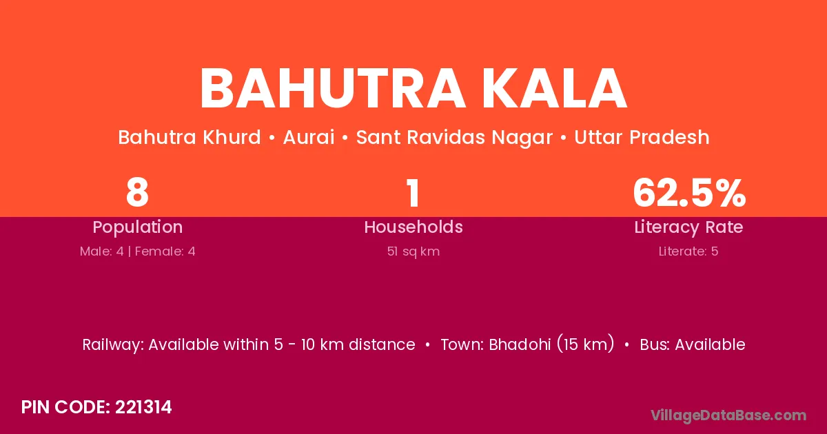 Bhadohi (15 km) is the nearest town to Bahutra Kala village for major economic activities and is located approximately 15 km away.