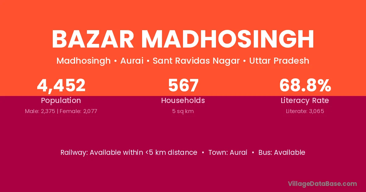 Bazar Madhosingh village has a total population of 4,452 people, of which 2,375 are males and 2,077 are females.