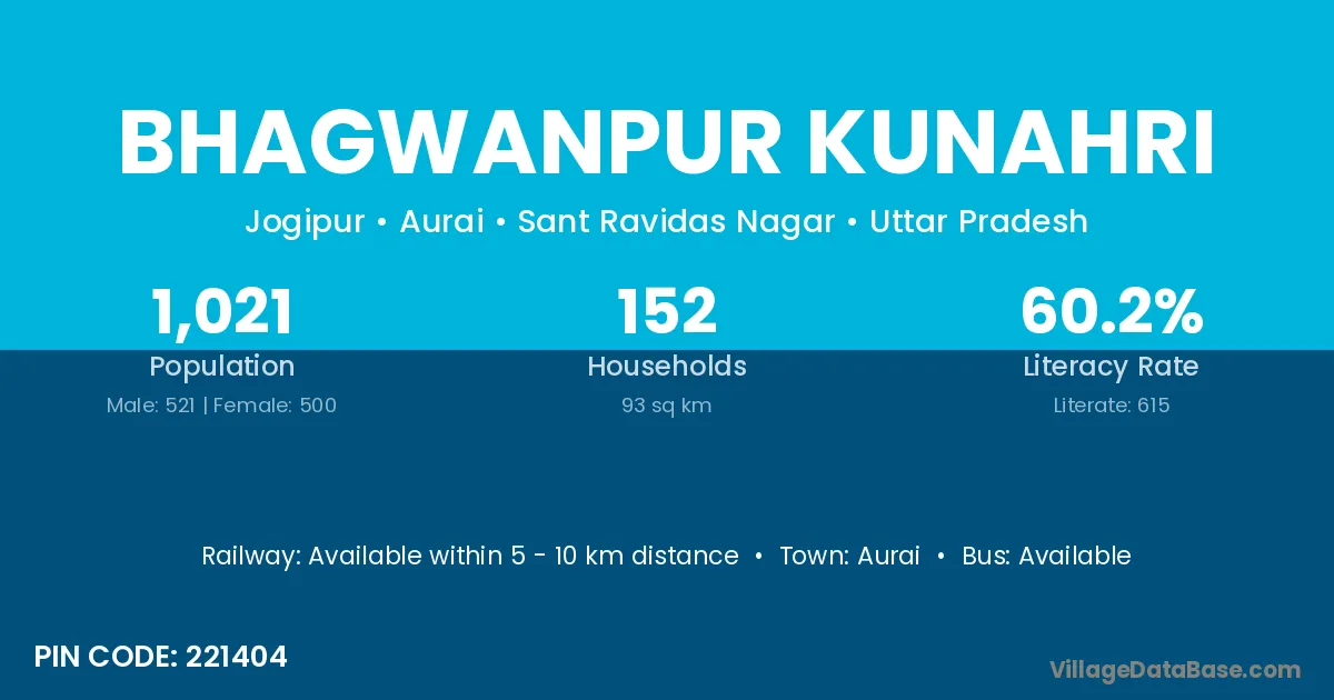 Bhagwanpur Kunahri village has a total population of 1,021 people, of which 521 are males and 500 are females.
