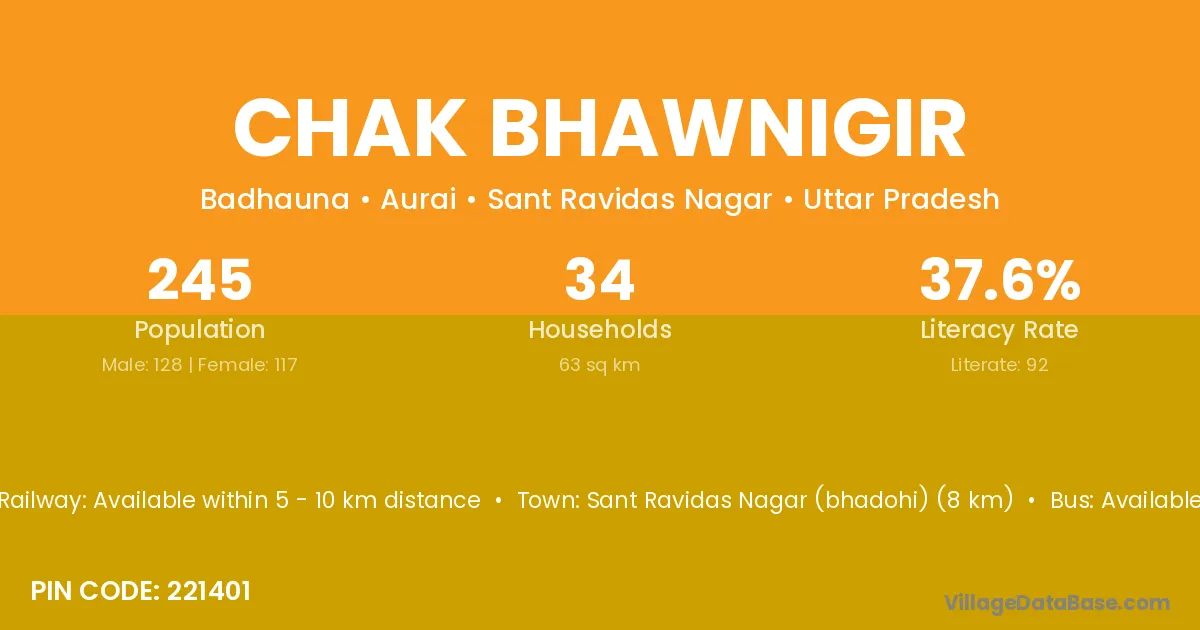 Sant Ravidas Nagar (bhadohi) (8 km) is the nearest town to Chak Bhawnigir village for major economic activities and is located approximately 8 km away.