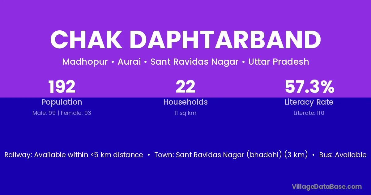 Sant Ravidas Nagar (bhadohi) (3 km) is the nearest town to Chak Daphtarband village for major economic activities and is located approximately 3 km away.