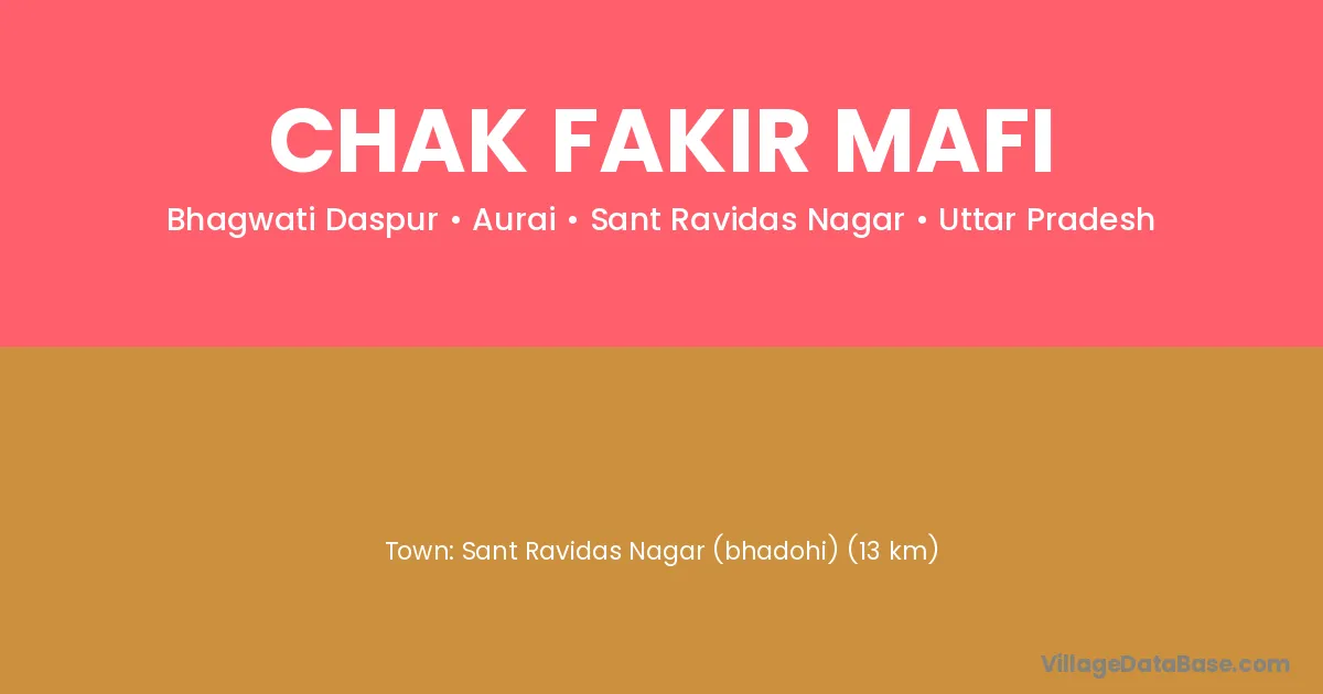 Sant Ravidas Nagar (bhadohi) (13 km) is the nearest town to Chak Fakir Mafi village for major economic activities and is located approximately 13 km away.