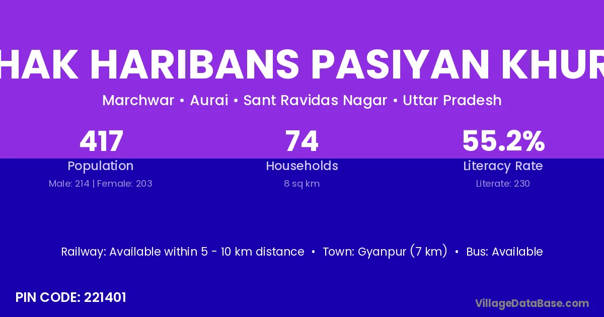 Gyanpur (7 km) is the nearest town to Chak Haribans Pasiyan Khurd village for major economic activities and is located approximately 7 km away.