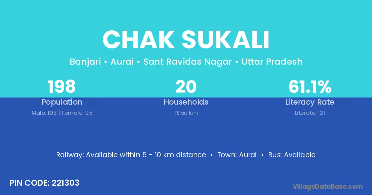 Chak Sukali village has a total population of 198 people, of which 103 are males and 95 are females.