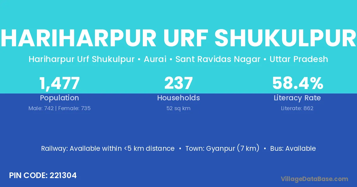 Hariharpur Urf Shukulpur village has a total population of 1,477 people, of which 742 are males and 735 are females.