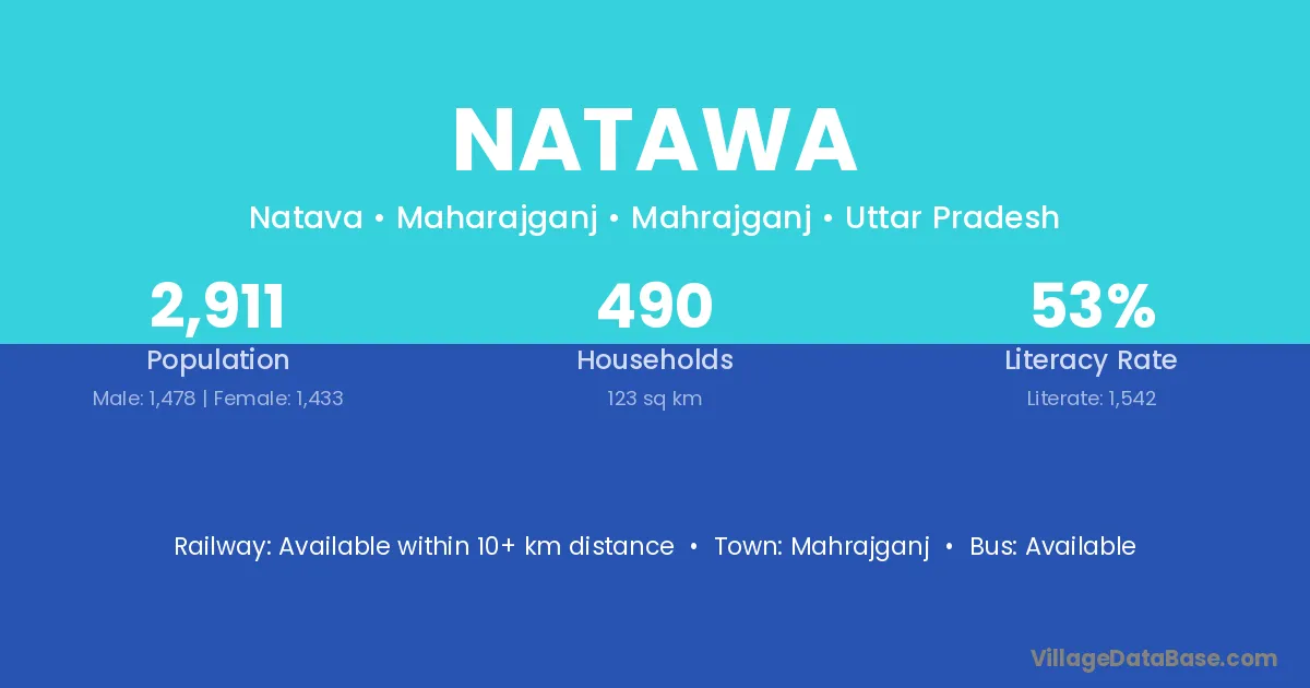 The literacy rate of Natawa village is 56.51%. Male literacy stands at 68.35% and female literacy at 43.05%.