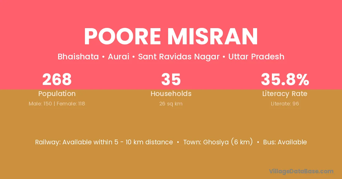 Ghosiya (6 km) is the nearest town to Poore Misran village for major economic activities and is located approximately 6 km away.