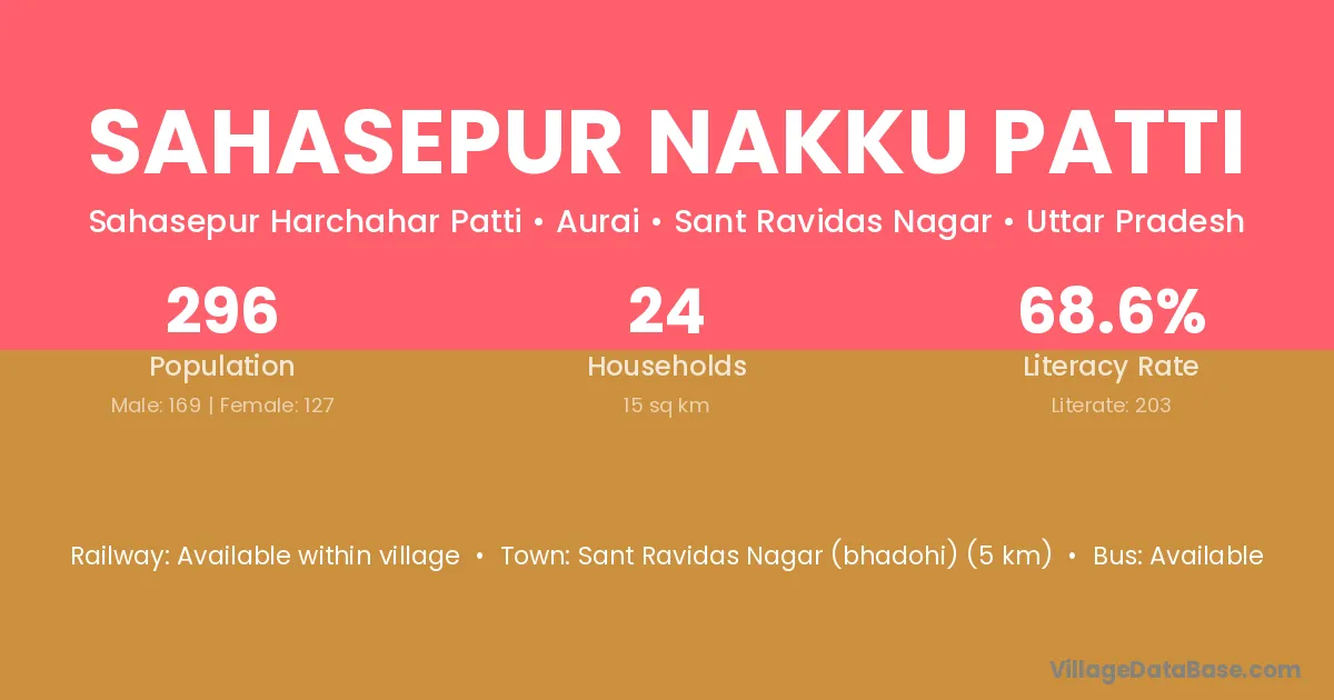Sant Ravidas Nagar (bhadohi) (5 km) is the nearest town to Sahasepur Nakku Patti village for major economic activities and is located approximately 5 km away.