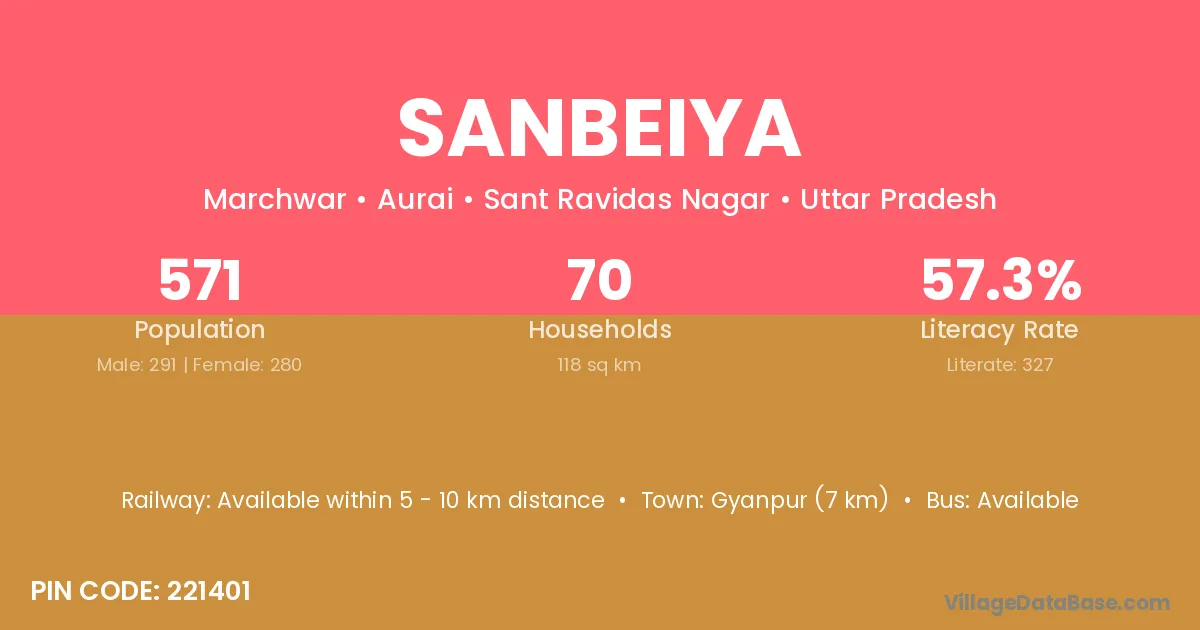 Gyanpur (7 km) is the nearest town to Sanbeiya village for major economic activities and is located approximately 7 km away.