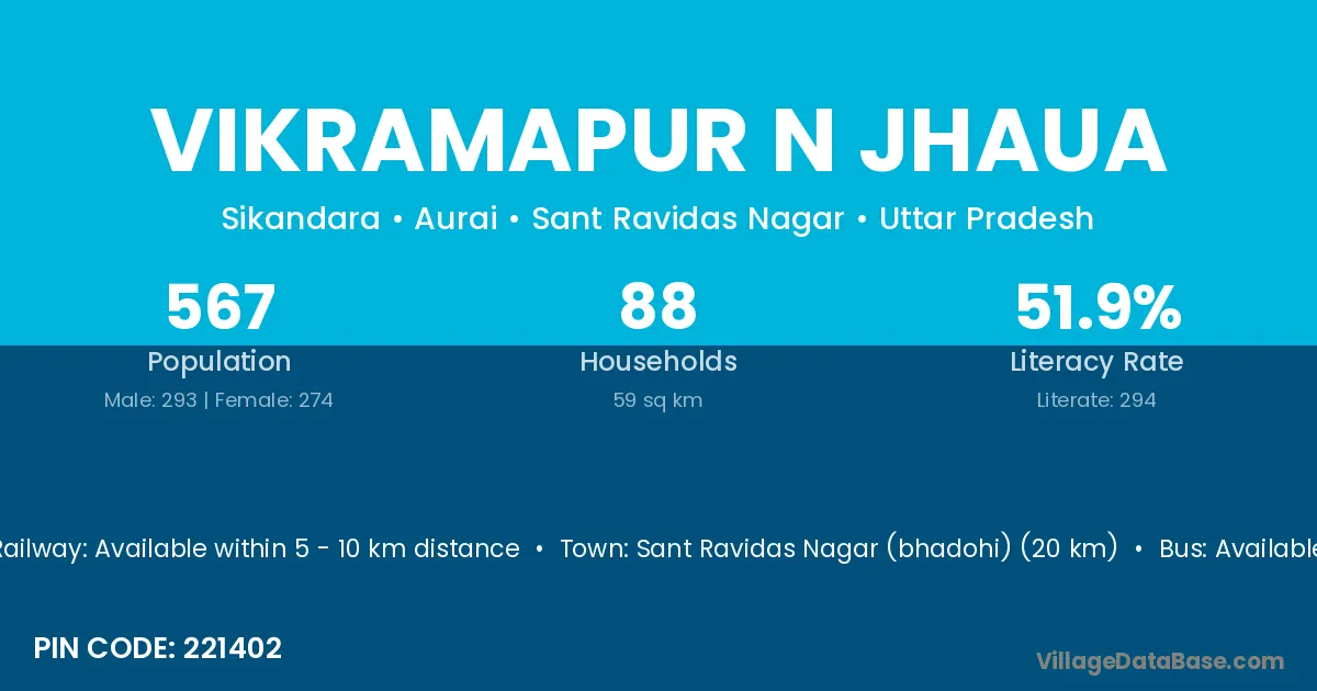 Sant Ravidas Nagar (bhadohi) (20 km) is the nearest town to Vikramapur N Jhaua village for major economic activities and is located approximately 20 km away.
