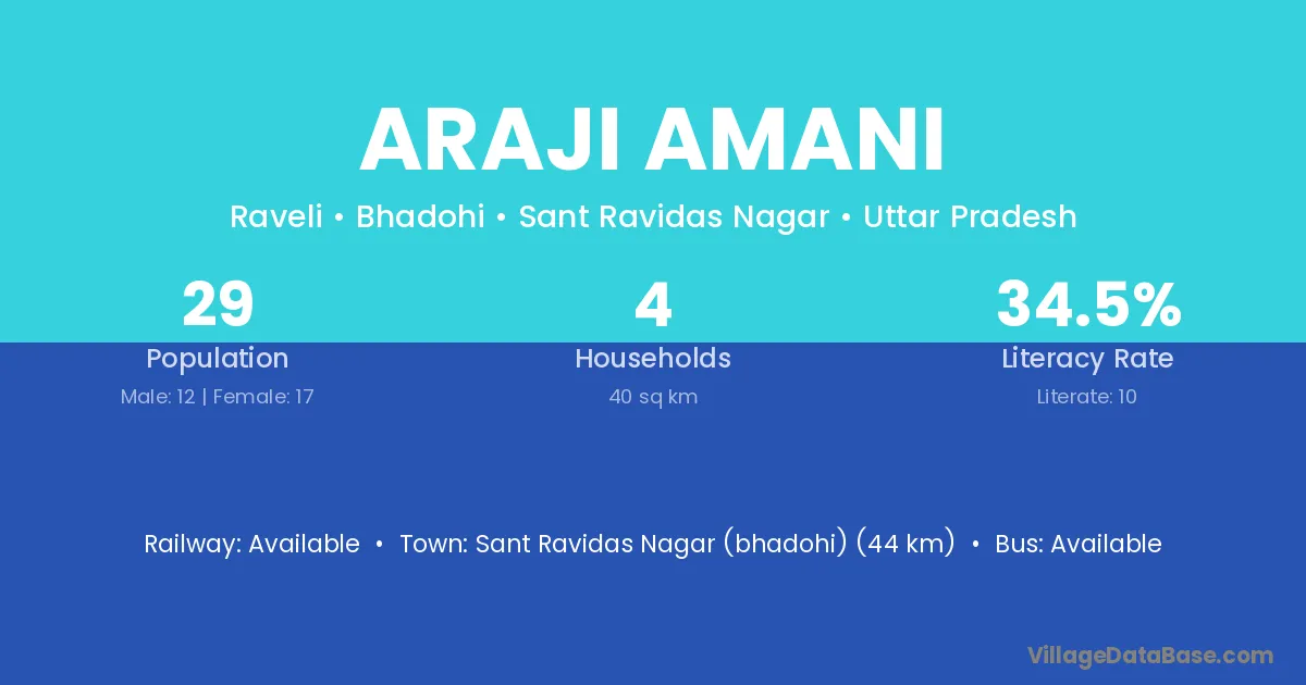 Sant Ravidas Nagar (bhadohi) (44 km) is the nearest town to Araji Amani village for major economic activities and is located approximately 44 km away.