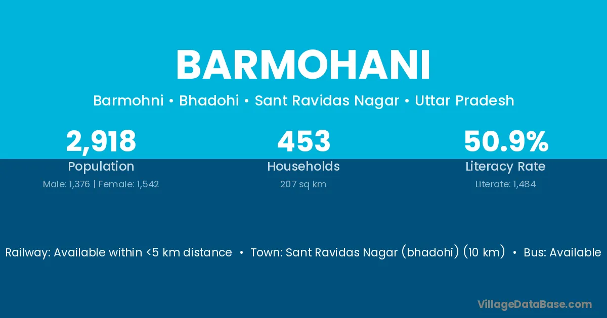 Sant Ravidas Nagar (bhadohi) (10 km) is the nearest town to Barmohani village for major economic activities and is located approximately 10 km away.
