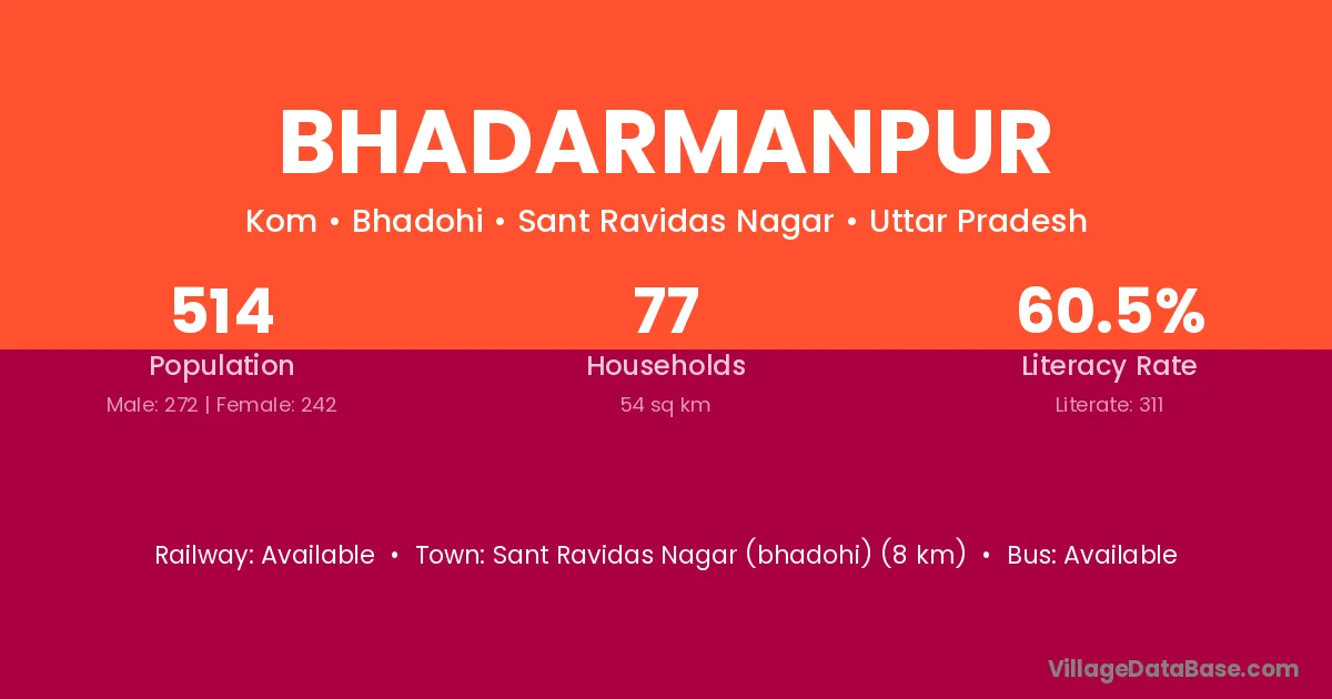 Sant Ravidas Nagar (bhadohi) (8 km) is the nearest town to Bhadarmanpur village for major economic activities and is located approximately 8 km away.