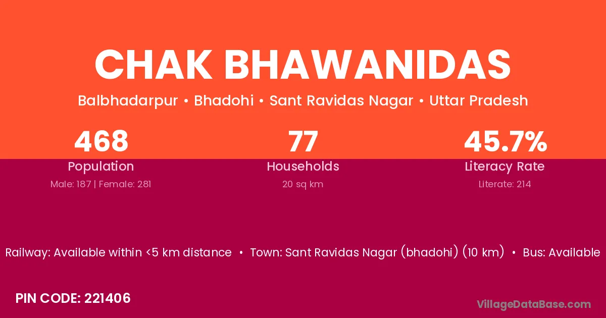 Sant Ravidas Nagar (bhadohi) (10 km) is the nearest town to Chak Bhawanidas village for major economic activities and is located approximately 10 km away.