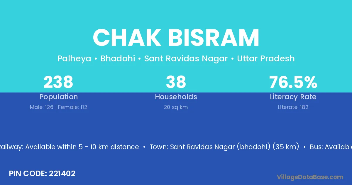 Sant Ravidas Nagar (bhadohi) (35 km) is the nearest town to Chak Bisram village for major economic activities and is located approximately 35 km away.