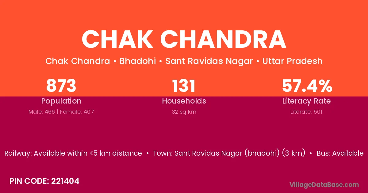 Sant Ravidas Nagar (bhadohi) (3 km) is the nearest town to Chak Chandra village for major economic activities and is located approximately 3 km away.