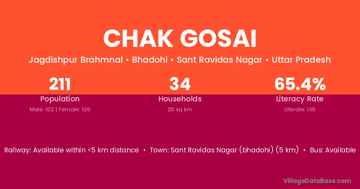 Sant Ravidas Nagar (bhadohi) (5 km) is the nearest town to Chak Gosai village for major economic activities and is located approximately 5 km away.