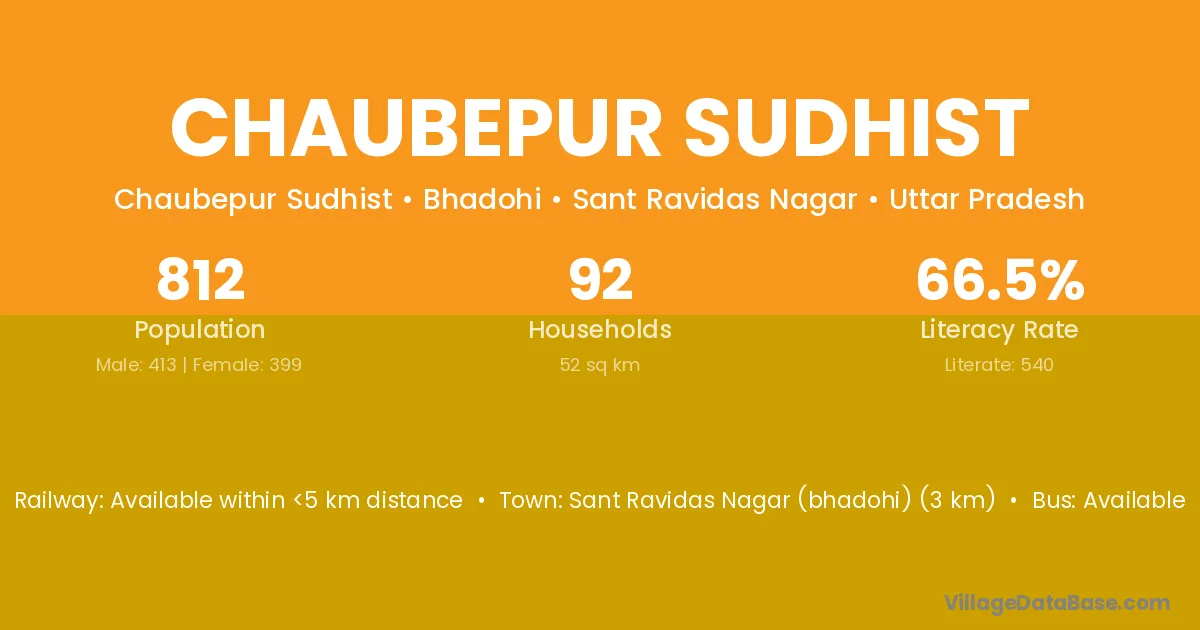 Sant Ravidas Nagar (bhadohi) (3 km) is the nearest town to Chaubepur Sudhist village for major economic activities and is located approximately 3 km away.