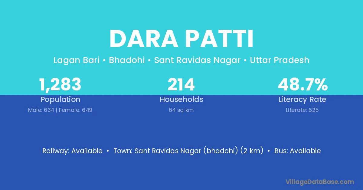 Sant Ravidas Nagar (bhadohi) (2 km) is the nearest town to Dara Patti village for major economic activities and is located approximately 2 km away.