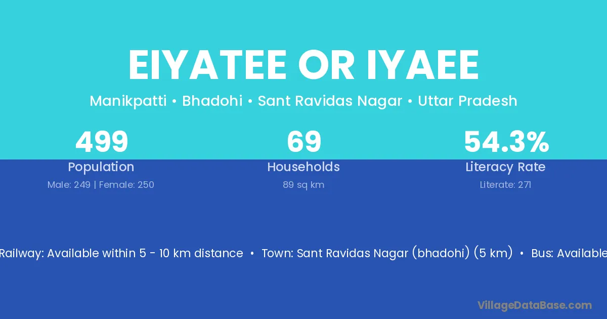 Sant Ravidas Nagar (bhadohi) (5 km) is the nearest town to Eiyatee Or Iyaee village for major economic activities and is located approximately 5 km away.