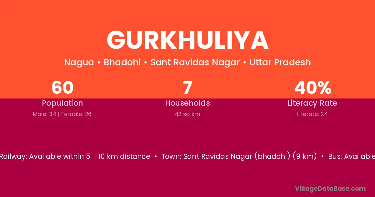 Sant Ravidas Nagar (bhadohi) (9 km) is the nearest town to Gurkhuliya village for major economic activities and is located approximately 9 km away.