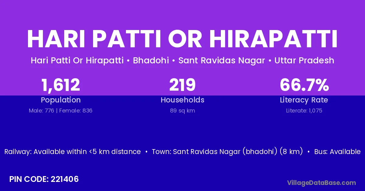 Sant Ravidas Nagar (bhadohi) (8 km) is the nearest town to Hari Patti Or Hirapatti village for major economic activities and is located approximately 8 km away.