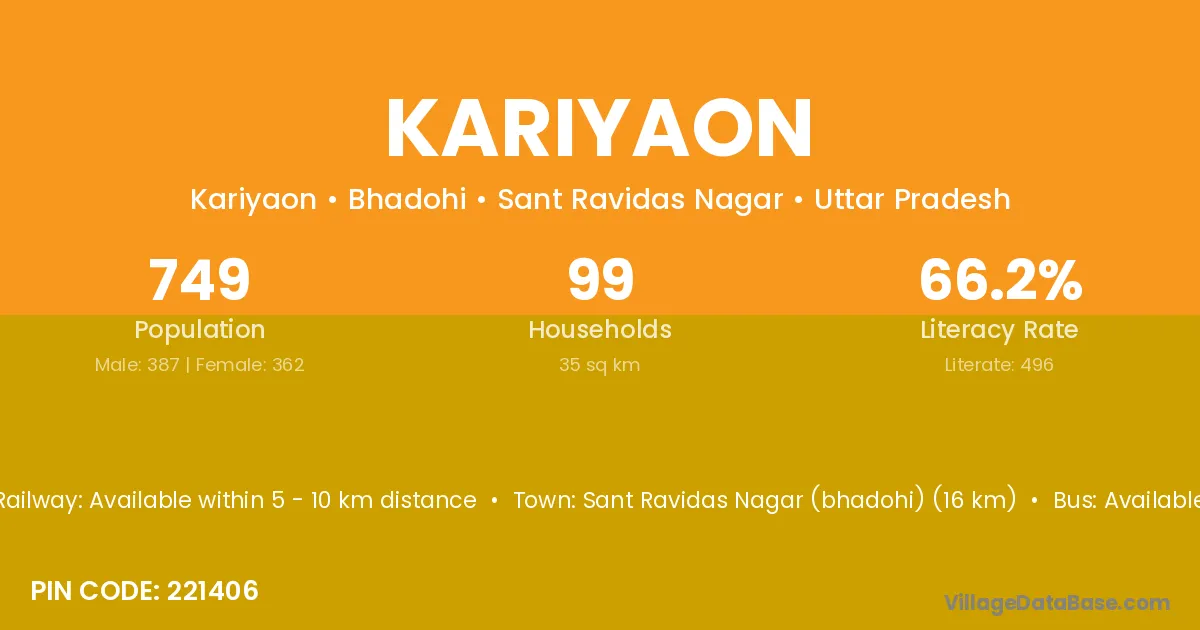 Sant Ravidas Nagar (bhadohi) (16 km) is the nearest town to Kariyaon village for major economic activities and is located approximately 16 km away.