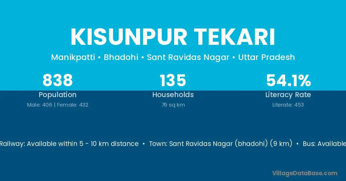 Sant Ravidas Nagar (bhadohi) (9 km) is the nearest town to Kisunpur Tekari village for major economic activities and is located approximately 9 km away.